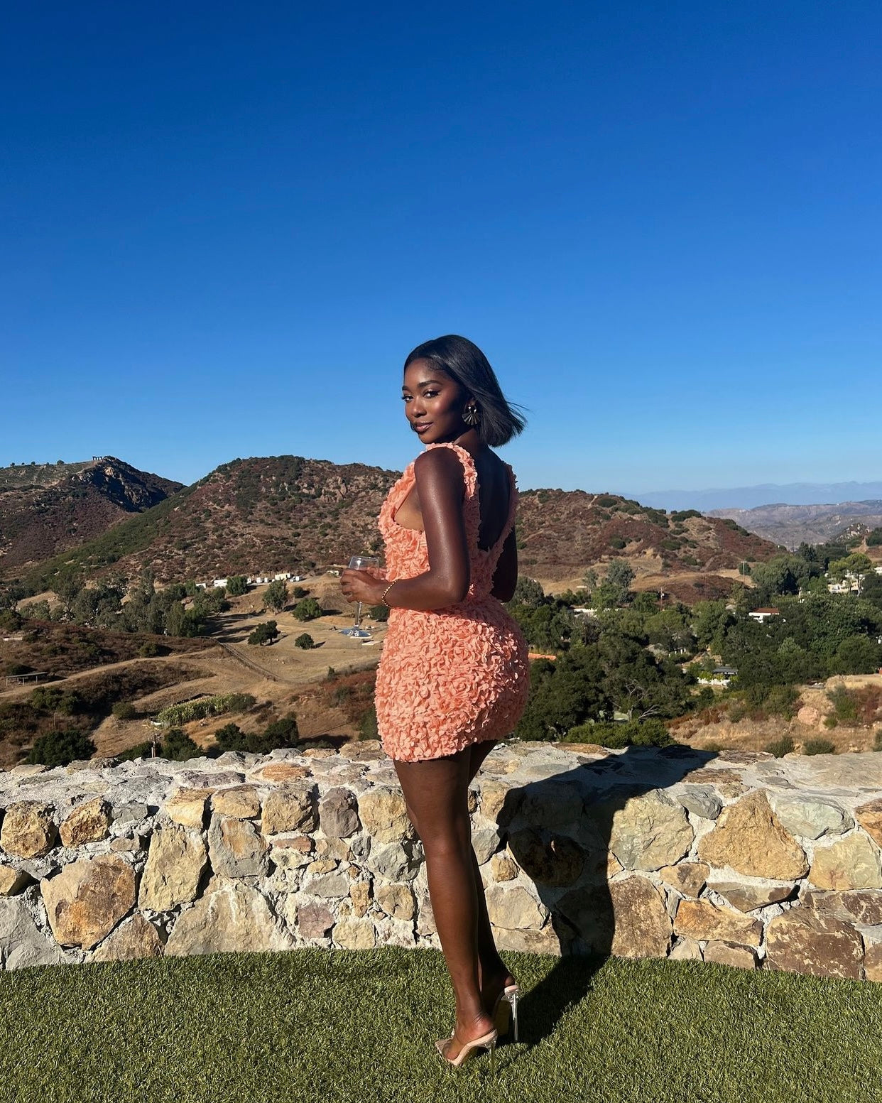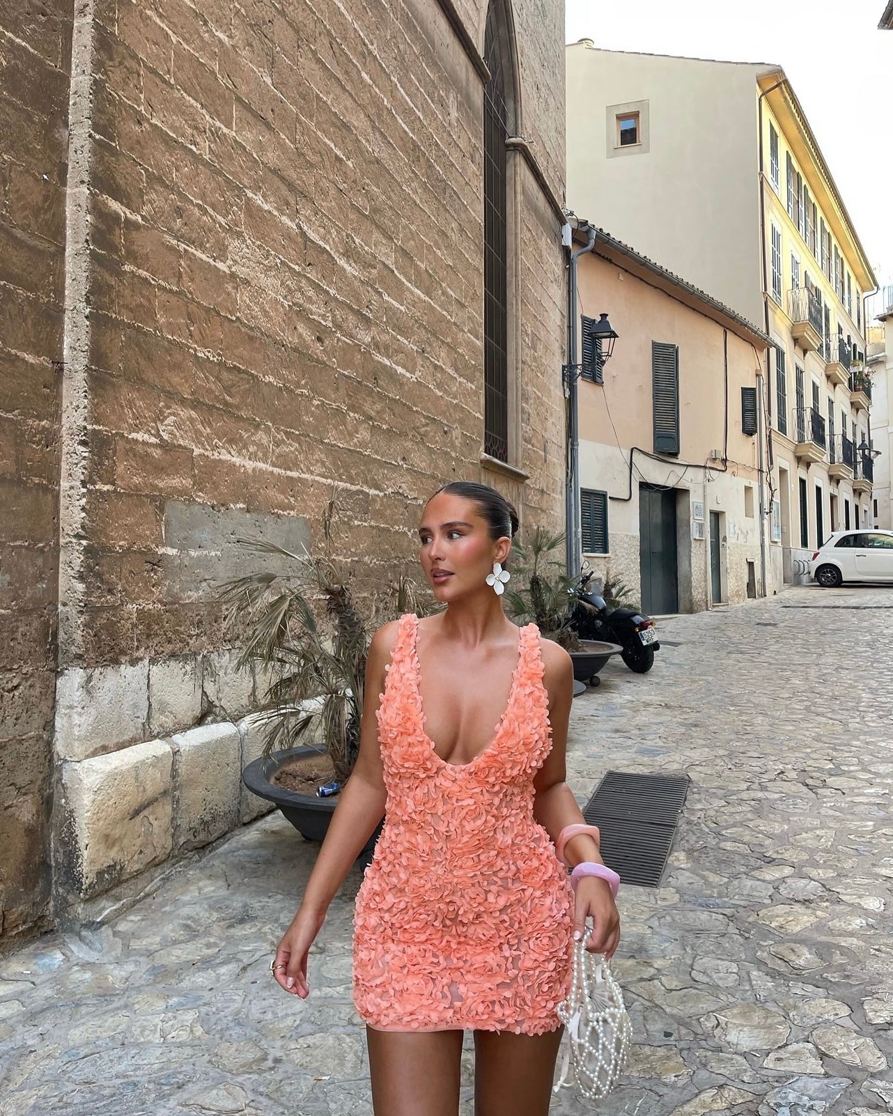 Faena mini dress is designed for glamorous summer events. It's presented in a sweet Sorbet hue and the whole vibe is ultra feminine with beautifully adorned 3D appliqué roses. It has a daring plunge neckline that mirrors the back perfectly and the close fit is ensured by stretch mesh lining. Short mini length so perfect for shorter girls and breast area confident.
